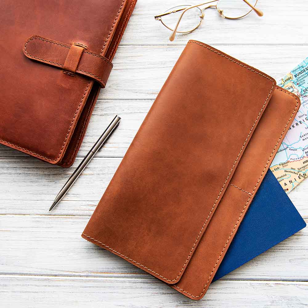 Spacious and secure, this leather travel wallet holds your travel documents and currency. Designed for the modern traveler.